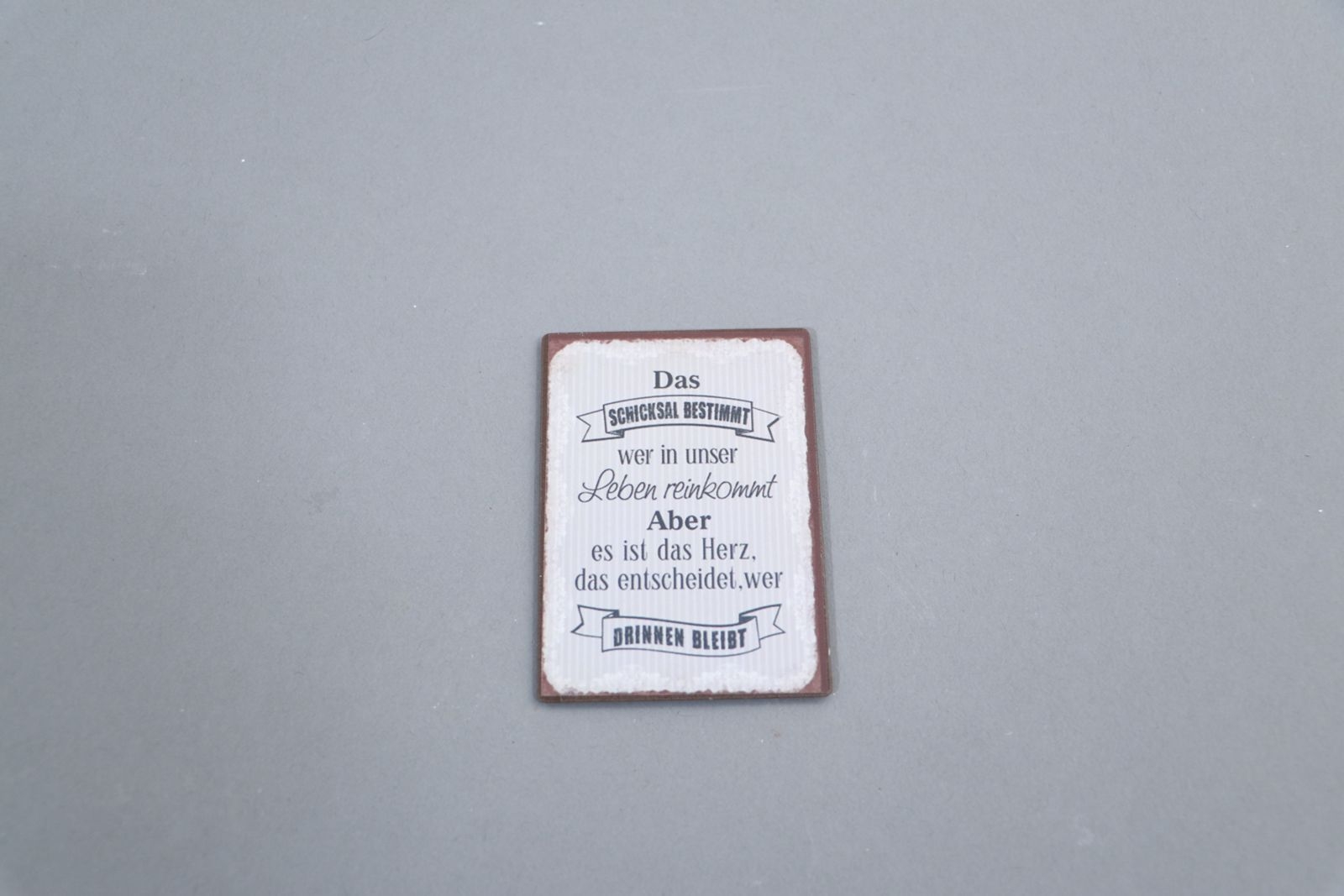 Magnete mit Spruch haben über die Fläche verteilt ein fest-montiertes Magnet. Spruch: Das Schicksal bestimmt, wer in unser Leben reinkommt, aber es ist das Herz ,das entscheidet, wer drinnen bleibt.