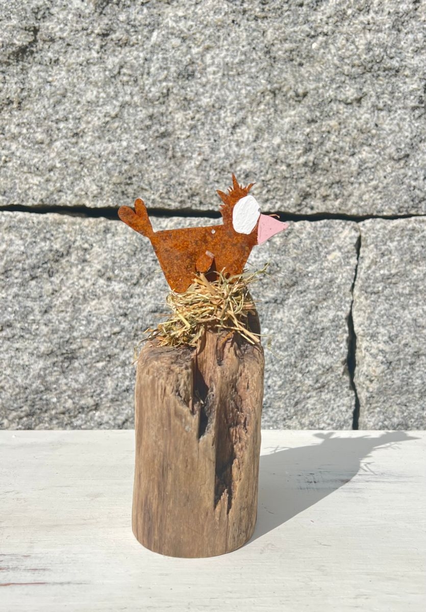 Schwemmholz mit einem Metallvogel im Nest
